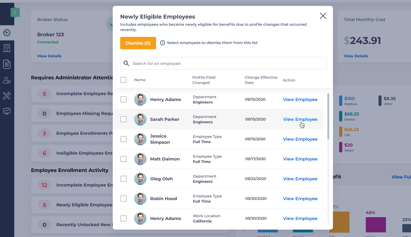 You may also remove employees from the list employees from this list by selecting the checkbox next to their name and selecting the Dismiss button.