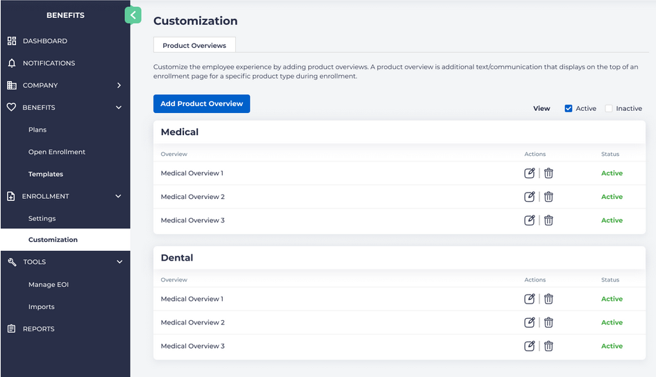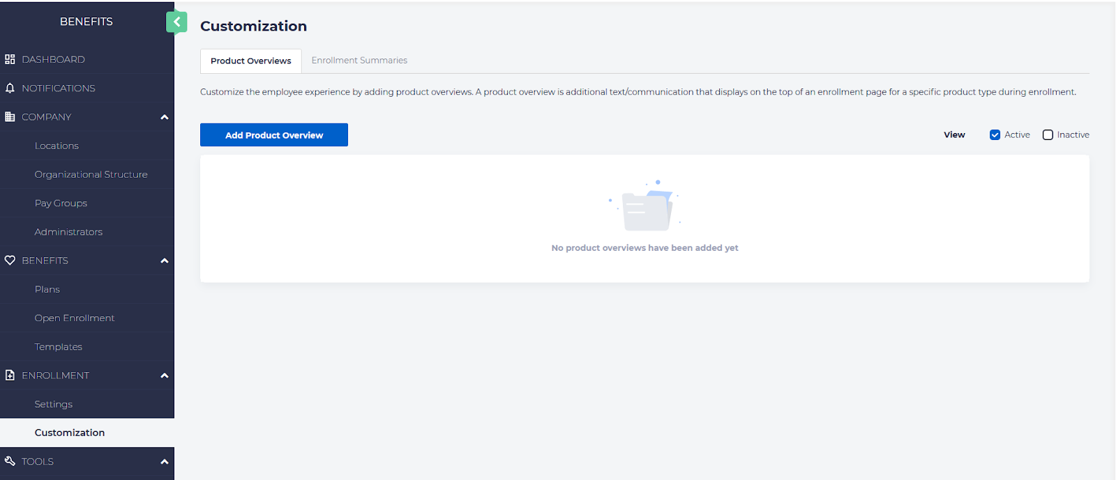 To create this, go to Enrollment – Customization and choose the Product Overviews tab.
